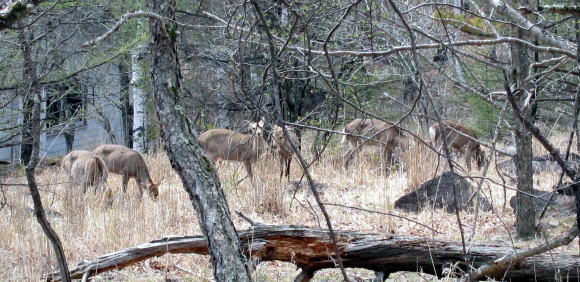 鹿だー。6匹ほどが草をむしゃむしゃと食べています。
