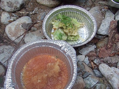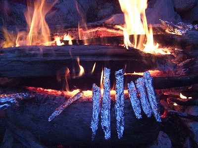 根曲り竹も、今年はすこし採れたので、たき火で蒸し焼きに。