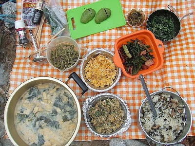 味噌汁、山菜ごはん、山ウドの炒め物、卵焼き、アボカド。