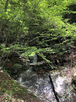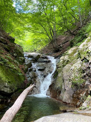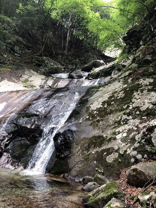 濡れると肌寒いですが、新緑とナメに癒されました。(二俣前のナメ滝)