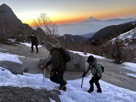 地蔵岳からの登り返しは、とにかくきつかった。ほとんどはっきりしません。徐々に水が尽き、喉がカラカラで口が張り付くような感触。雪を口にし、ついにはつららまで食べました。つららは不純物を多く含むため凍りにくく、あのとがった形になります。本来は食べてはいけない代物です。最初は土の味、次は苔の味。それでも二本目の半分まで口にしてしまいました。少しすると身体が楽になってきたので、改めて脱水の怖さをあらためて実感しました。