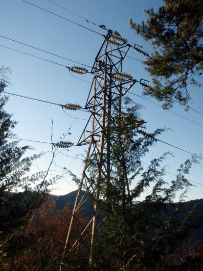 笹子峠へ下りる手前から古い小さな送電線に沿って北北西に尾根を下りました。昔はこんな小さな送電線で間に合っていたんだね。エコだな