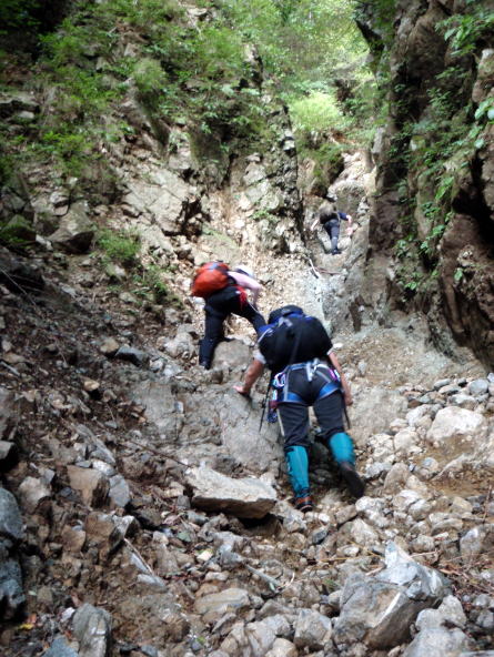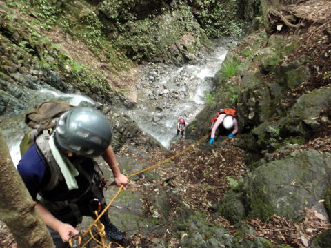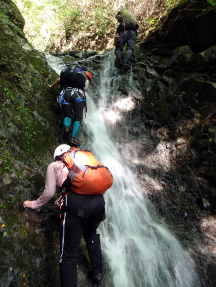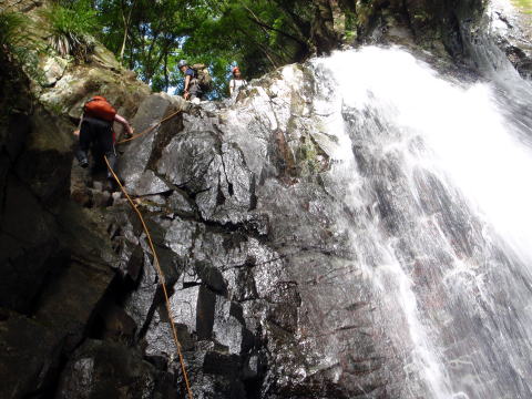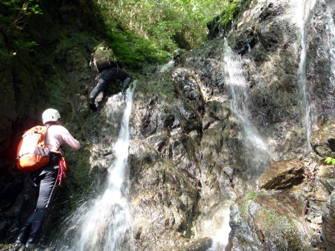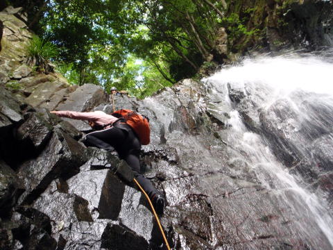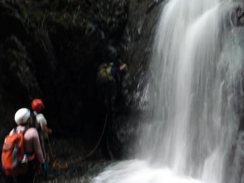 最初の滝(手前の小滝で落っこちてずぶ濡れになった人がいるけど、それはなかったことにしよう。)に若手が取りつきました