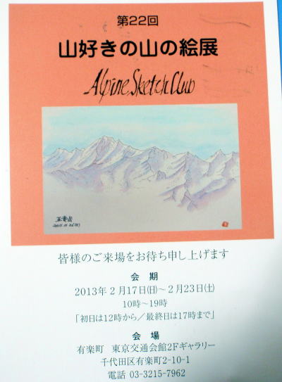 日本山岳会アルペンスケッチクラブ「山好きの山の絵展」の案内をいただきました。都合をつけて是非どうぞ