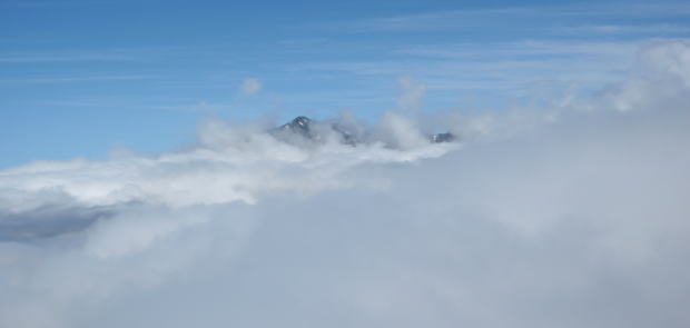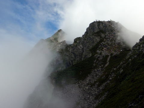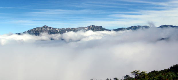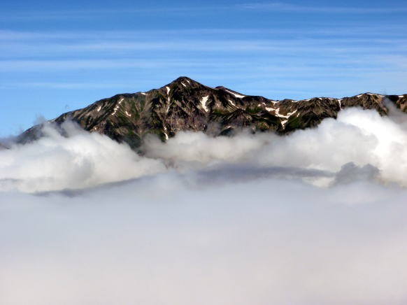 今は雲の上に出ていますが、だんだんと雲が上がってきているようです。こちらの尾根にも雲の切れはしがときどき飛んできます