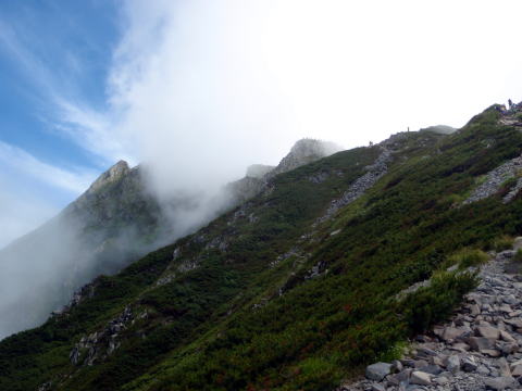 ほぼ30年ぶりに来た西穂高、こんなだったっけ。もう断片の記憶しかないけど、石ごろごろの急坂道が独標まで続いています