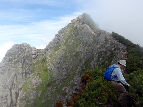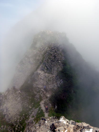 独標から西穂方向への下り、昔30年前の記憶だと、ビクビクしながらクライムダウンした部分があったような・・・道がつながっているね