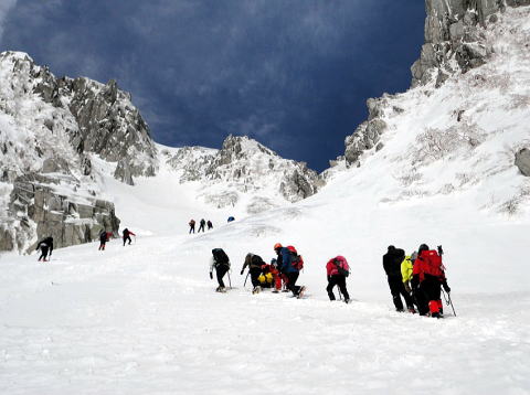 下から見上げる千畳敷カールは、雪に覆われて光っています。あんな所に行くんだぁ、とテレビを見ているような、夢を見ているような感覚で現実感がありません。