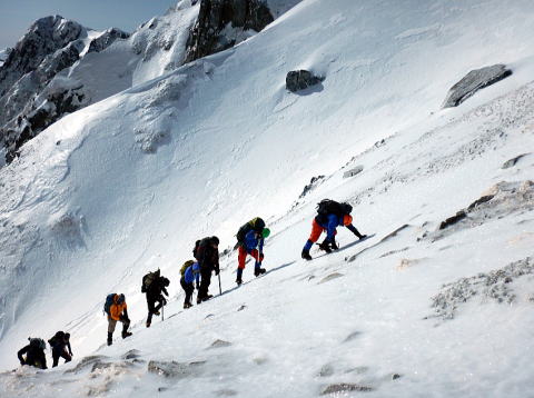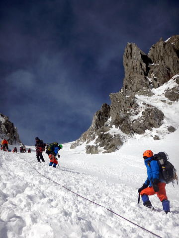 どこを触ろうが、何をつかもうと思っても、ツルツルに磨かれたような氷の雪面で、まったく止まらず、勢いも衰えません。岩も氷に包まれていて引っかかりもなく、あっという間に私の体は岩の上を滑って超えてしまいました。偶然、ピッケルがどこかに引っ掛かって止まりましたが、ショッキングな体験でした。