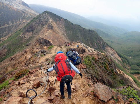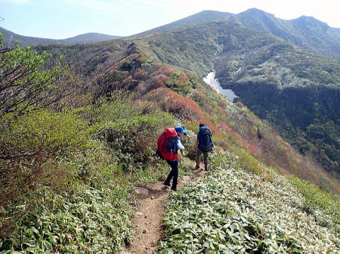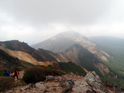 引き返して朝日岳へ、奥の山が茶臼岳