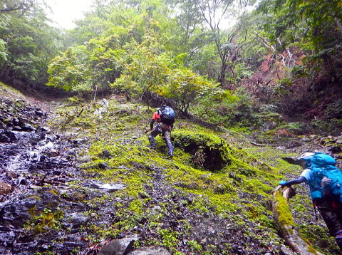 最後はそのまま沢をツメ、藪漕ぎ10分で登山道なはずが、なぜかガレガレの急登の方へと進むK隊長。