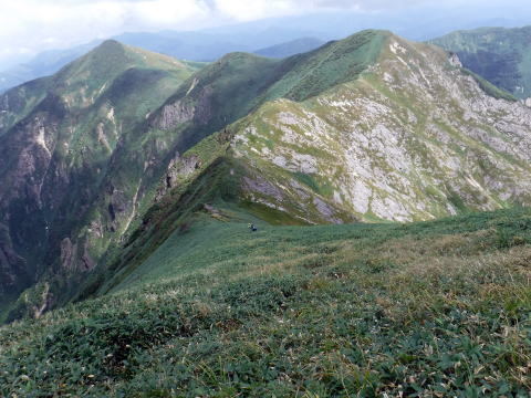笠ヶ岳から白毛門までは尾根歩き、眺望が良いので脇見厳禁で有る。正直、浮き石も多いので注意が必要…。私がずり落ちた…。