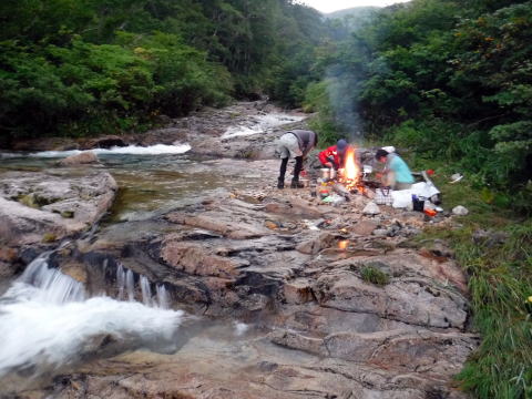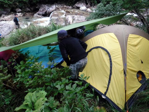 大石沢出合のすぐ上流にテントとタープを張る。