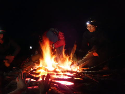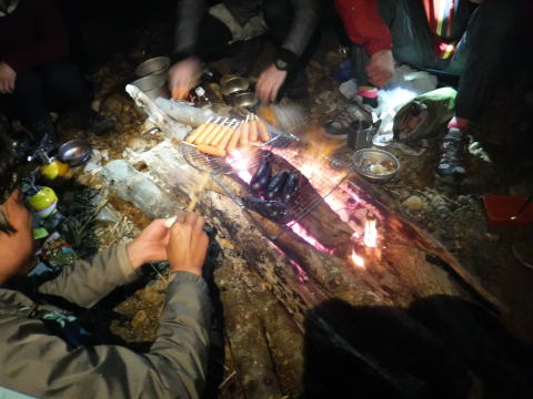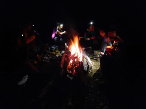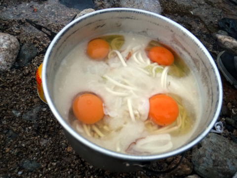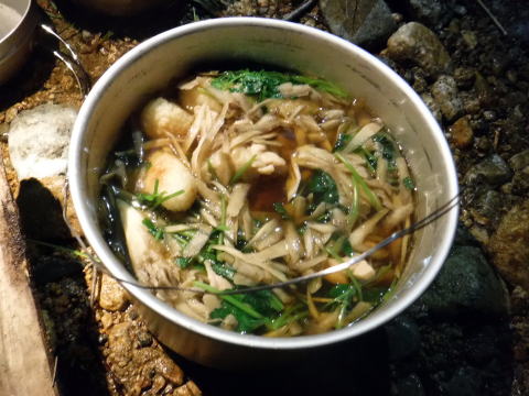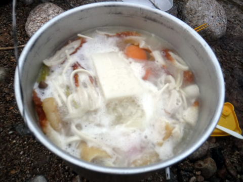 右岸高台でビバーク地を決めた。斜めってるが、何とか4名用テントとタープを張って、ウタコさん食当のきりたんぽ鍋。締めはもっこすラーメン。