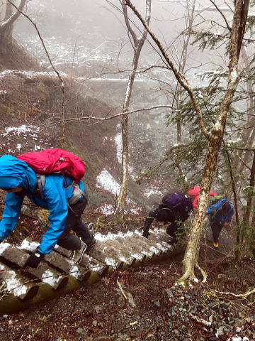 秦野峠をいっきに下り、いよいよ最後の目的地、親分が35年前に行ったというシダンゴ山を目指す。この登りが、丹沢らしい木段の急登(男坂)で、テンションが上がった。自分自身と向き合うのに、急登ほど良いものはないだろう。すでに7時間以上歩き、疲れもピークに達している中、みんなで一歩一歩、山頂を目指した。