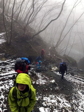 開けた場所で小休憩を取りつつ、檜岳(ヒノキダッカ)を目指す。雪が5〜6センチほど積り、霧の効果で幻想的な景色の中、足を進める。檜岳山頂は、霧で眺望がないものの、みんな素敵な笑顔である。すでに、特殊な高山病を発症している者にエールを送りつつ、次なる目的地、伊勢沢ノ頭へ。