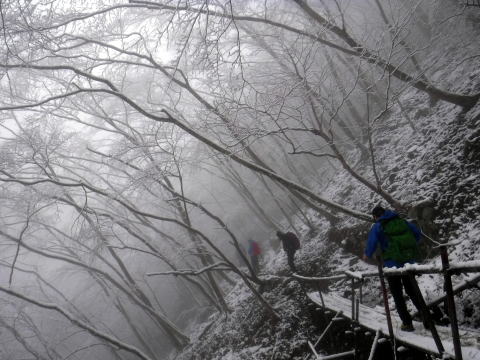 雨山峠までの道は、悪天候だったこともあり、少しヒヤヒヤする梯子揚がいくつかあった。