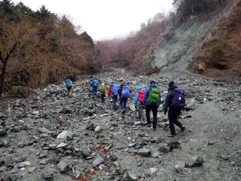 なんと、一度目の渡渉で、親分が水の中にドボン。ズボンや靴がずぶ濡れになってしまった。まだ、登山口にも辿り着いてないのに…。
