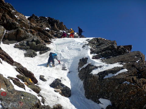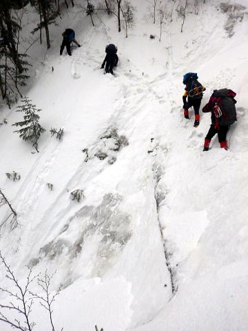 凍ってるところは固くてピッケルが刺さらないので、差し込む場所を探しながら降りてゆきます。