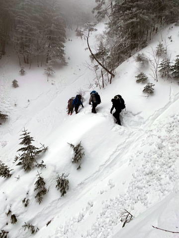 途中、沢を渡るところは雪が深かったりして結構大変でした。