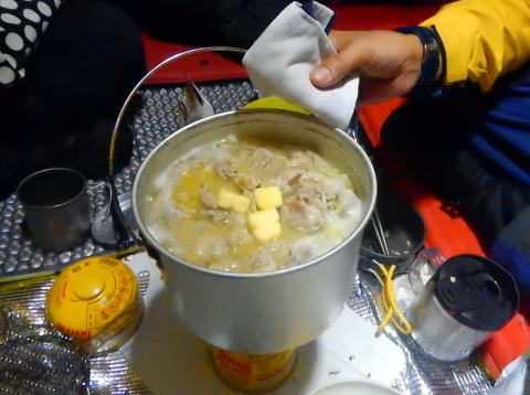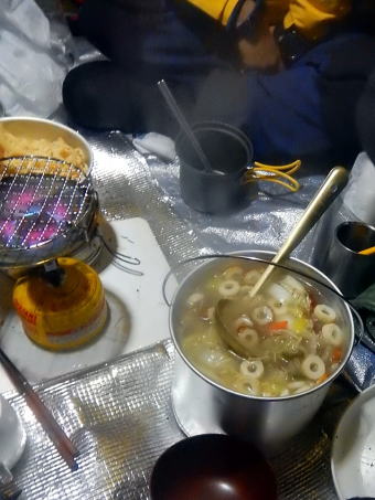 途中で陽が沈んでしまいヘッドライトを付けての本谷山越え。だんだん寒くなるし、まあテントに戻れば休めるのだけれど果たして無事に戻れるのか不安でした、、メンバーの方々に助けられて何とかテントに着いたのがナント20時過ぎ!