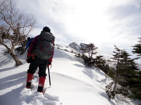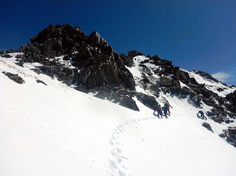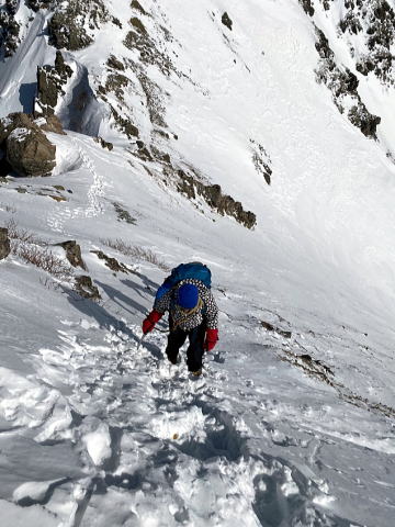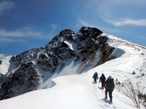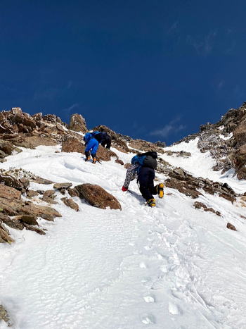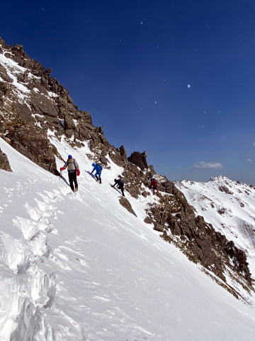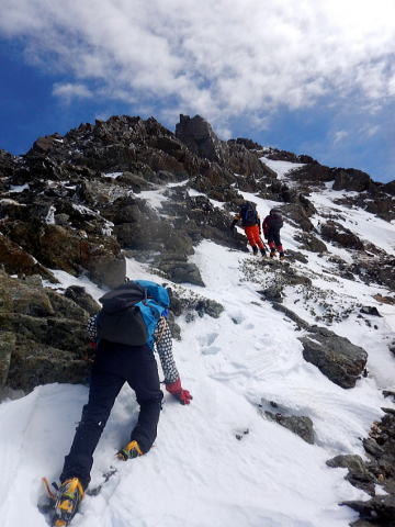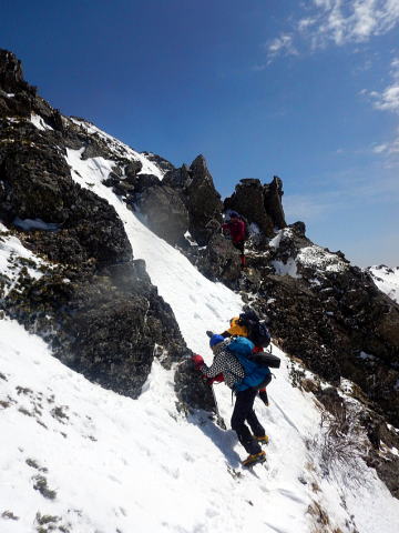天狗岩の取りかかり。想像以上に岩岩しい岩稜をトラバース。落ちたら大変です。ピッケルとアイゼンをしっかり雪面に刺して蹴り込んで、三点支持を意識して進みます。