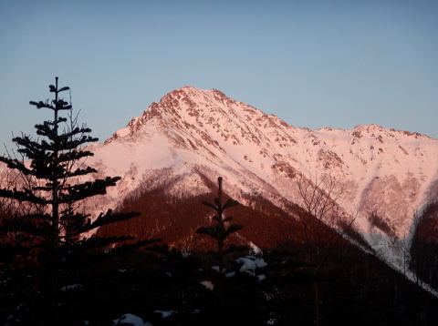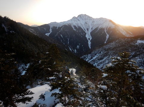 我々は今日のうちに出来るだけ先へ、全くトレースのない道を進みます。尾根道に出ると遠くに塩見岳が見えました。格好いい、、