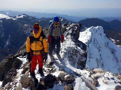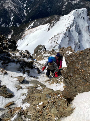 岩場の下りで一部凍っているところはザイルを使いました。上で親分に確保してもらいながらバックステップで一歩一歩。
