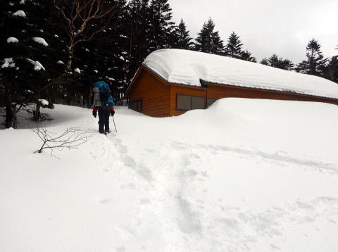 冬季小屋には一人の登山者がビバークしてました。3日も前からいたとのこと。この後どうするのだろう、、