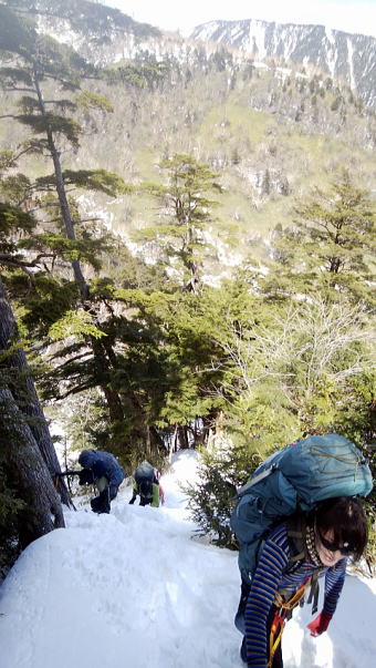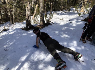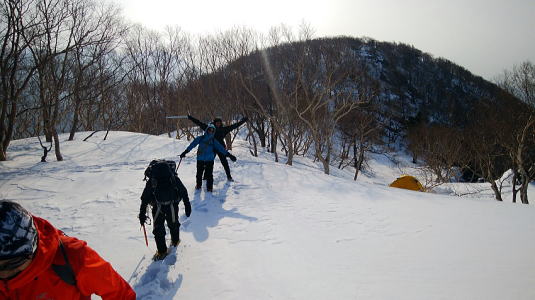 ジェントルM氏の足の運び方やピッケルのつき方等をアドバイスしてくれる優しさに励まされながら、外山に到着。