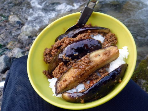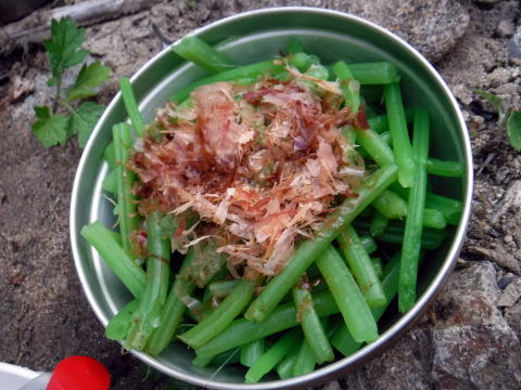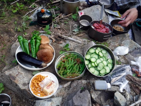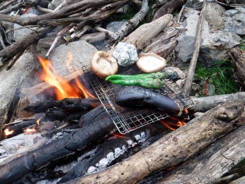 ビール、お酒のおつまみ、焚き火で焼く茄子椎茸シシトウにポテトサラダ・・・手早く出来るもんだねえ、と感心するだけの・・