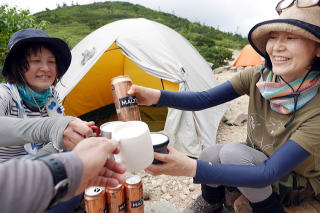 直射がきつくなってきた黒部五郎小屋に向かう途中の雪渓で、ナント、I氏がかき氷を作ってくれました!