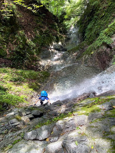 最初は3〜5mくらいの小さな滝やナメ滝を越えていきます。梅雨明けで天気良く、気持ちのいい遡行です。