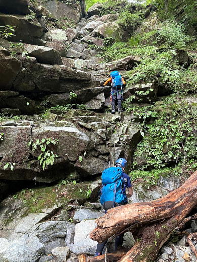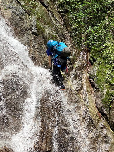 小さい滝でも足をのせるホールドを探すのが難しいときがあります。なるべく小刻みにホールドを探して登っていきます。