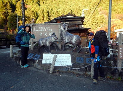 1日目のルートは、沢口山〜天水〜八丁段〜山犬段避難小屋。 最初に目指すは寸又三山の沢口山です。寸又峡温泉街のカモシカ像の脇を通り、登山口へ。