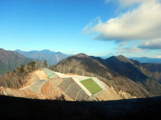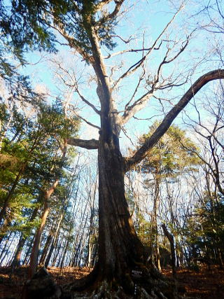 最初の尾根に登るのが急登なだけで、山頂までは比較的緩やかなコース。道もしっかりあり、寸又三山だけあって気持ちいいハイキングコースです。途中、鹿のヌタ場脇に巨木のミズナラが現れます。迫力満点で、山の素晴らしさを改めて実感。そこからもう少し頑張れば、山頂に到着です。南アルプスの山々が見え、テンションもあがります!