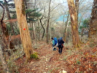 板取山を下ると林道があり、この林道沿いを歩けば山犬段へ着きます。が!私たちは頑張って八丁段も登ることに。1日目で一番こたえたのが、ここの急登。のっしり、のっしり登り切ります。頑張って登ったかいもあり、展望場からはキラキラ光る海も見えました。