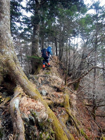 千石平を過ぎると、急登です。出たなー、南アルプス!と思いながら元気よく登ります。が…ここはやせ尾根+左右は崖のよう。崖マークが何故ついていない、と思うほどの斜面です。多分滑落したら止まらない、と思いましたが、左右を一切見ずに何とか登ります。
