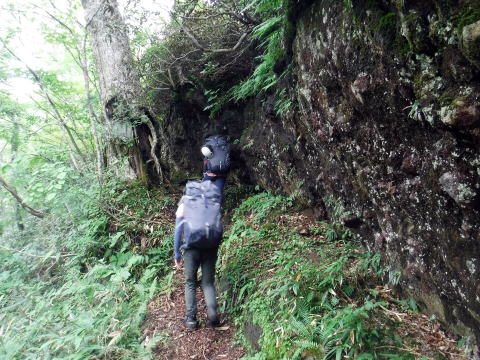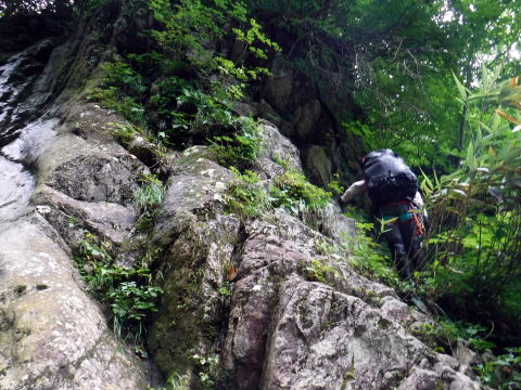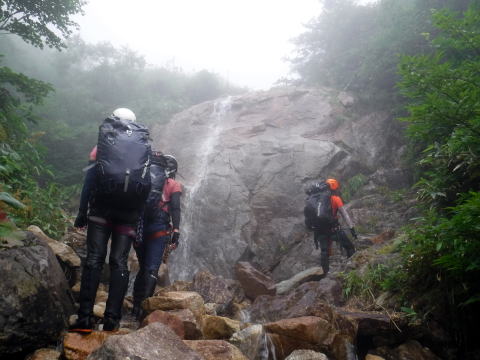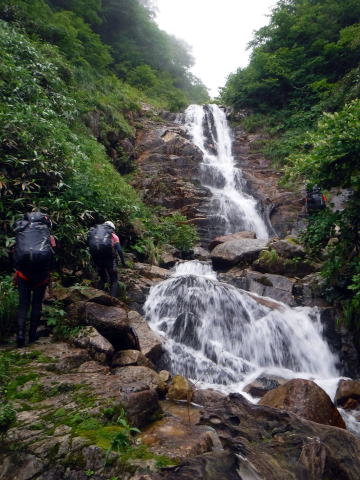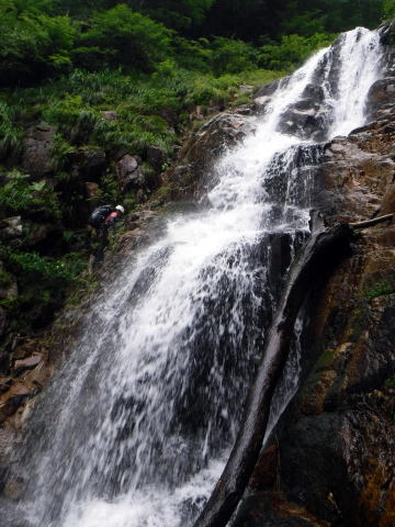 末広がりの滝は高巻きます。高巻きは、慎重に。