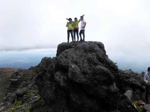 まずは茶臼岳を登ります。ロープウェイもあるので頂上は、観光地のよう。軽装な人も多くみられました。そんな中、高いところが大好きなヒマラーさんは大きな岩に上ります。真似して登って”はいポーズ”