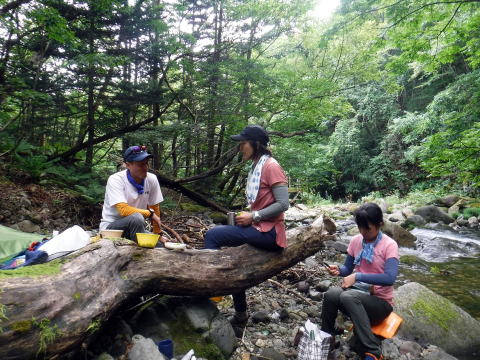 趣のある山小屋、温泉。のんびりつかりたい気持ちをグッと堪えて先に進みます。今日のテン場は三斗小屋温泉跡。井戸沢の出合いです。小一時間歩き、たどり着きひと安心。