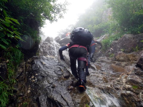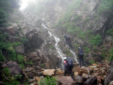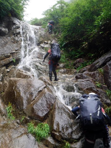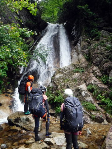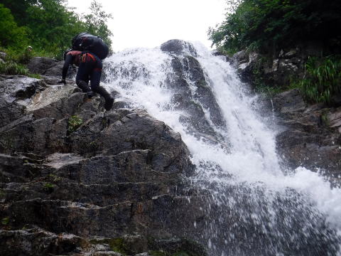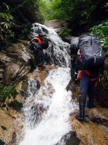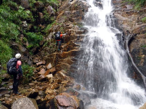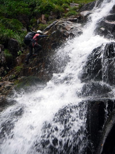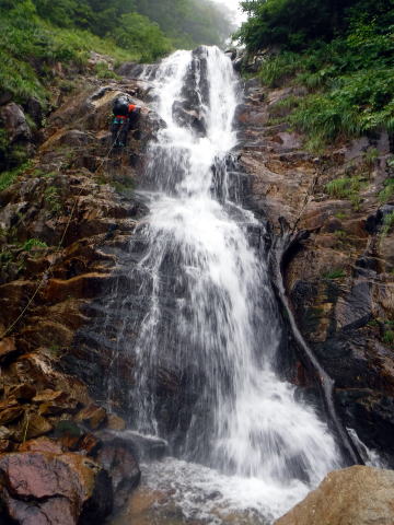 15m階段状の滝。ここは、高度感があるので、ザイルを出します。リードはヒマラーさん。この一本のザイルがあるなしで安心感が全然違います。