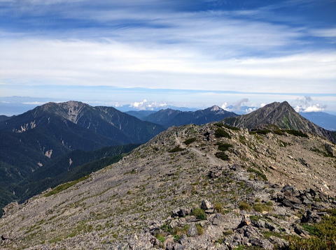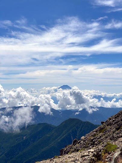 間ノ岳へ到着すると360度絶景が広がります。40分ほどのんびり滞在しましたが、飽きることのない景色。富士山と中央アルプス、北アルプスに囲まれ、山脈にいるんだ~!と山に浸ります。ちなみに千畳敷カールまではっきりと確認できました!山頂でお話したグループは、農鳥、大門沢のルートで縦走するとか。羨ましい限りです…。