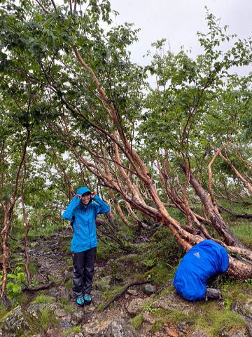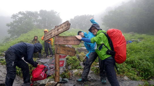 コースタイムでは2時間40分ですが、この日は各自テントを持っていたのと、段々強く降る雨で3時間以上はかかりました。でも、雨で塗れた木々の色が濃く、山を感じながらストレスなく登れました。ここまでは…。