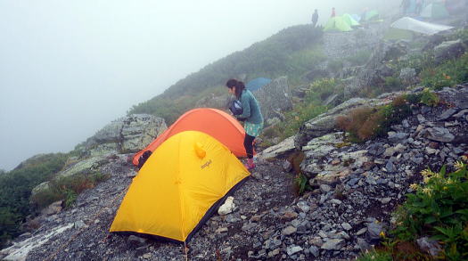 14時に到着し、3張幕営できそうな場所を確保。やはりテン場は混んでいました。稜線でコケツさんとバンベーさんを待つのは寒すぎたので、トイレの小屋の隙間から稜線を覗いて二人を待ちます。15時に全員到着し、着替えて体を温めます。この日ほど、着替えの有難さを感じたことはなかったです…。