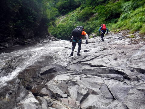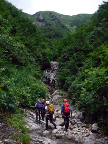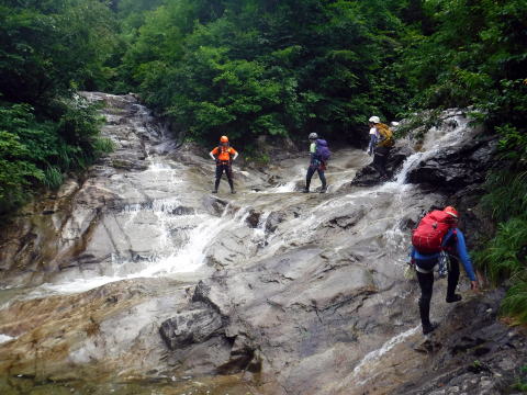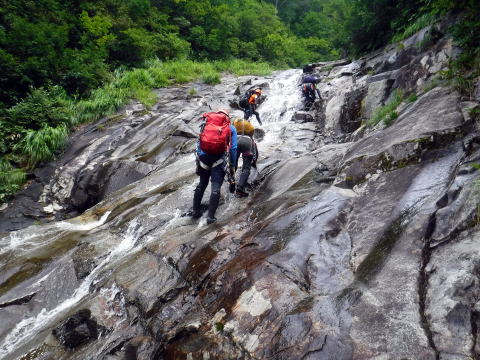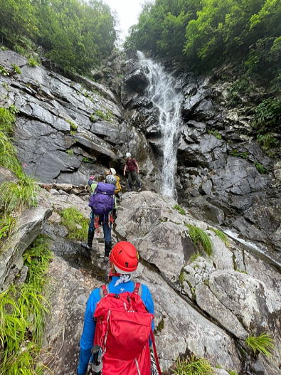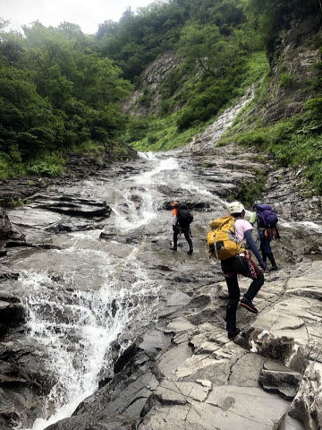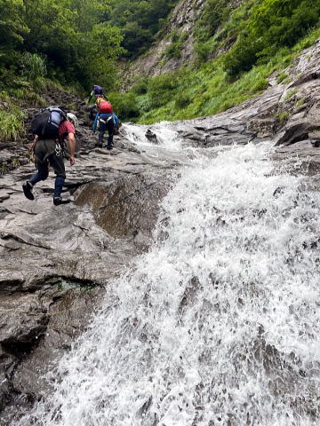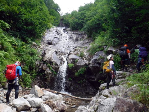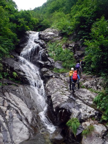 手前の滝を右岸から巻いてすぐにタラタラのセンの滝下へ。踏み跡が続いていて上へ上へと行きそうになるが、我慢して小さく巻くことが重要。親分の指示がしっかり飛んできました「戻ってこーい」無事タラタラのセンの滝下へ降りました。