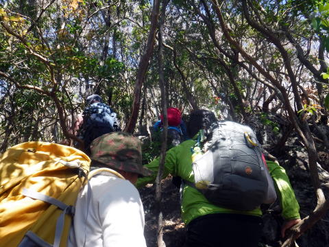 1300m—1400mは岩場の急登。最後に大岩が待ち構えています。クライミング慣れてないとスリングの補助が必要なところでした。