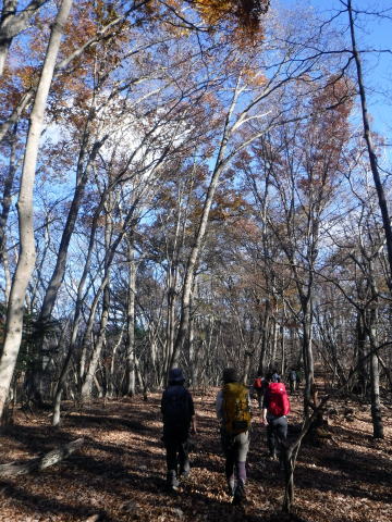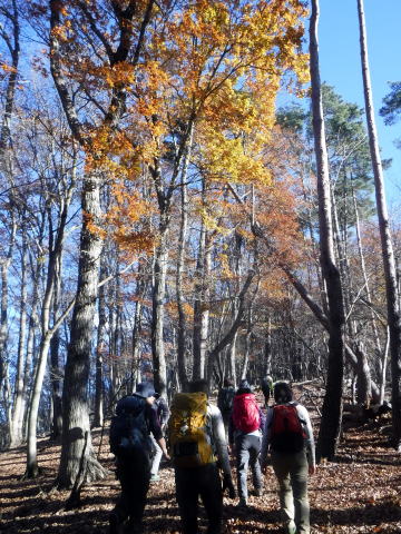 殿平からは落ち葉が綺麗な尾根道を鞍吾山手前のピーク中平(1030m)目指して進みます。とても歩きやすい。ただ、ピーク手前の50mは等高線通り手足を使って登る急登でした。登り切ると1本取りました。
