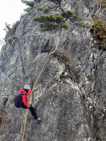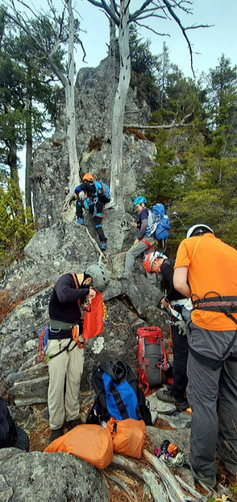 懸垂下降で第3岩峰を降ります。右手は絶対はなさないこと!皆、慣れたものでさっさと降りて行きます。ただ、懸垂下降での事故が一番多いとのこと。油断せずにこれからも懸垂下降しましょう。