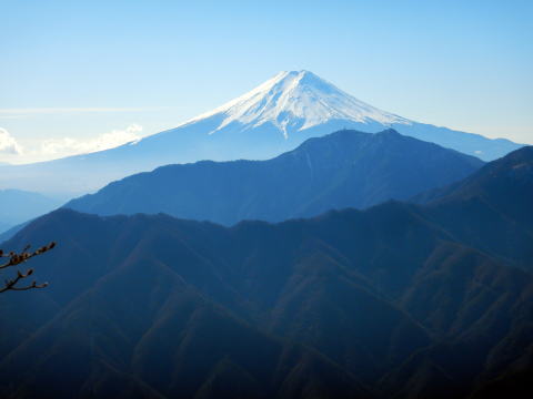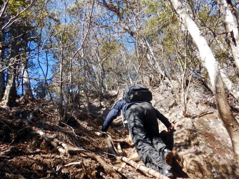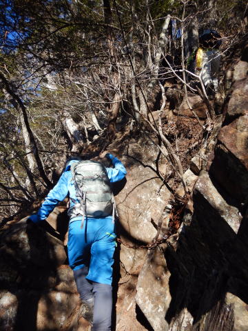 背後に富士山の頭が見え始める辺りから、尾根は岩まじりに急になる。しっかりしたスタンスがあるので難しくはないけど、高度感はありました。